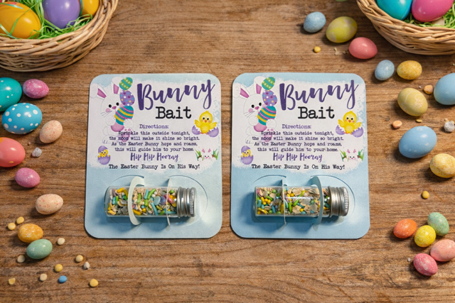 Each card includes an charming printed card with a mini vial filled with colorful "bunny bait"